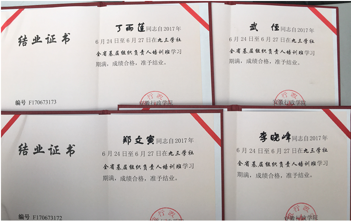 6月24-27日,九三学社安徽省2017年基层组织负责人培训班在安徽行政学院开班。安农大基层委李晓峰、武恒、丁雨莲和郑文寅作为基层组织负责人参加了此次的集中学习培训并顺利结业。