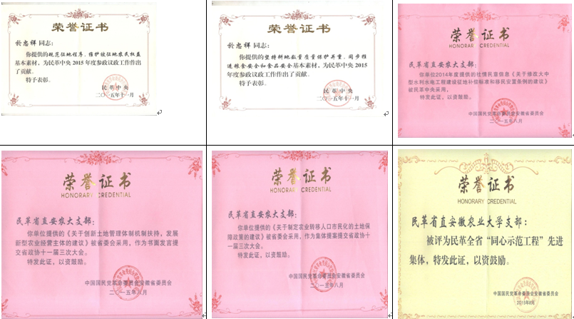 於忠祥主委向大家通报了支部参政议政工作取得的成绩。在2015年,民革安农大支部获省直基层组织2015年度工作考评第一名,全年向民革安徽省委会提交了8份提案,向民革中央提交了3份提案,并由民革中央提交到全国政协,开创了民主党派基层组织参政议政的先河。其中,《规范征地程序,维护群众合法权益》提案获时任省委副书记、现任省长李锦斌和省委常委、常务副省长詹夏来重要批示;《坚持耕地数量质量保护并重,同步推进粮食安全和食品安全》和《规范征地程序,维护被征地农民权益》两份提案,获民革中央表彰;民革安农大支部被评为全省“同心示范工程”先进集体;於忠祥、董春雨同志获民革安徽省委反映社情民意先进个人称号;於忠祥获“2015年度为民革中央参政议政工作作出贡献的先进个人”称号等荣誉。