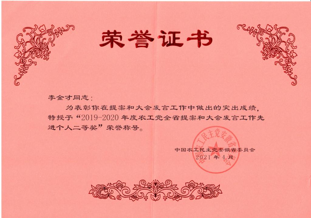 近日,农工党安徽省委员会对全省各级组织2019-2020年提案和大会发言工作中取得的突出成绩予以表彰。农工党安农大总支主委李金才荣获“先进个人”荣誉称号。