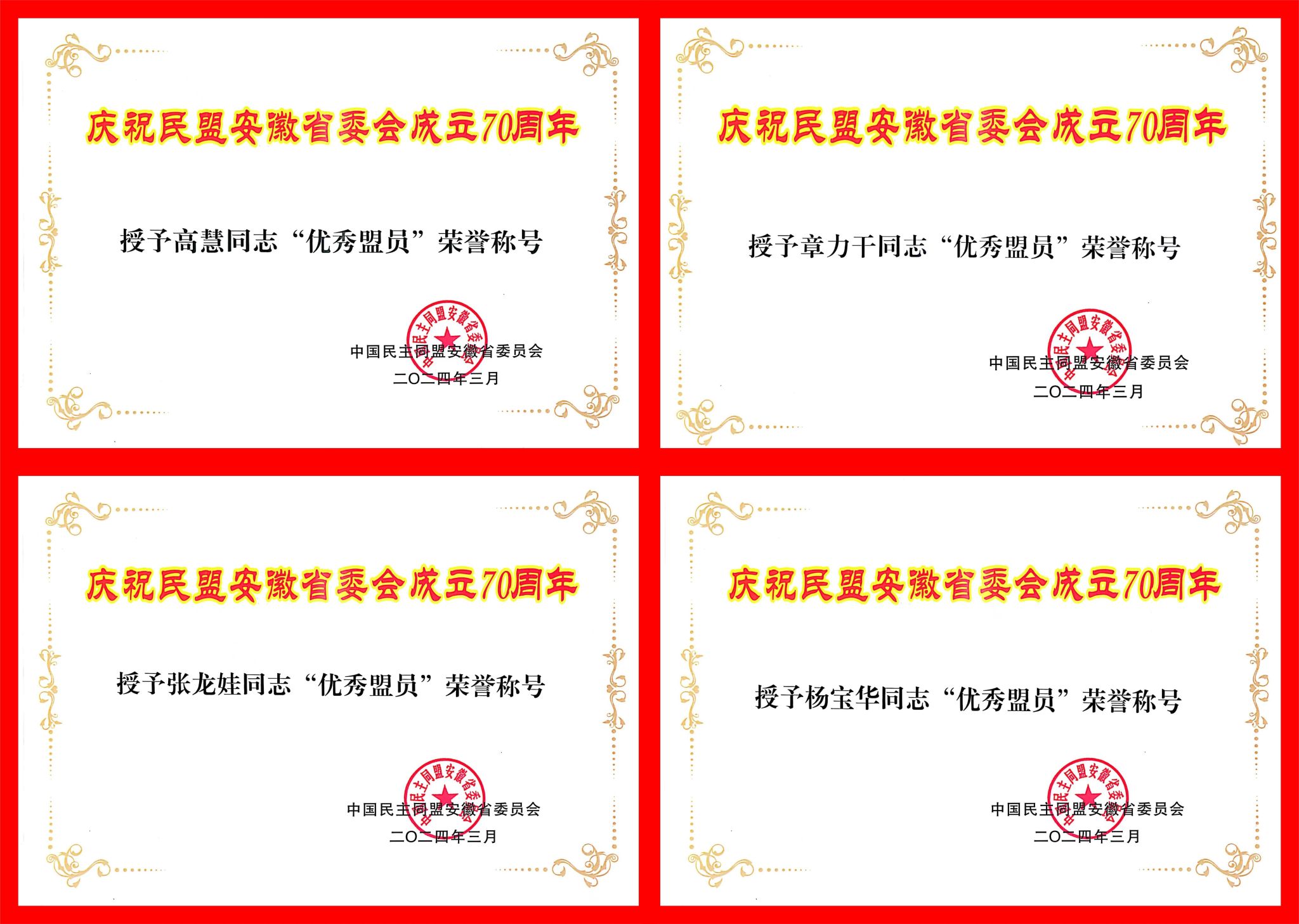 民盟安农大基层委员会被民盟安徽省委授予“先进基层组织”。盟员高慧、张龙娃、章力干、杨宝华被评为民盟安徽省委成立70周年“优秀盟员”。