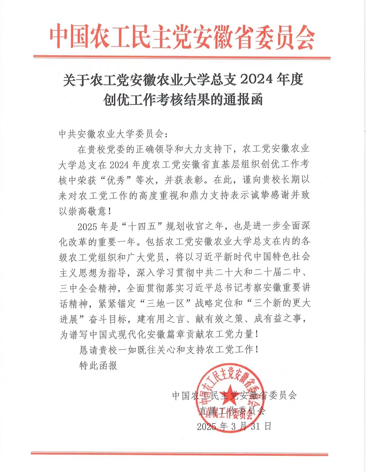 本网讯 近日,中国农工民主党安徽省委员会公布2024年度基层组织创优考核结果,我校农工党总支再度获评"优秀"等次。