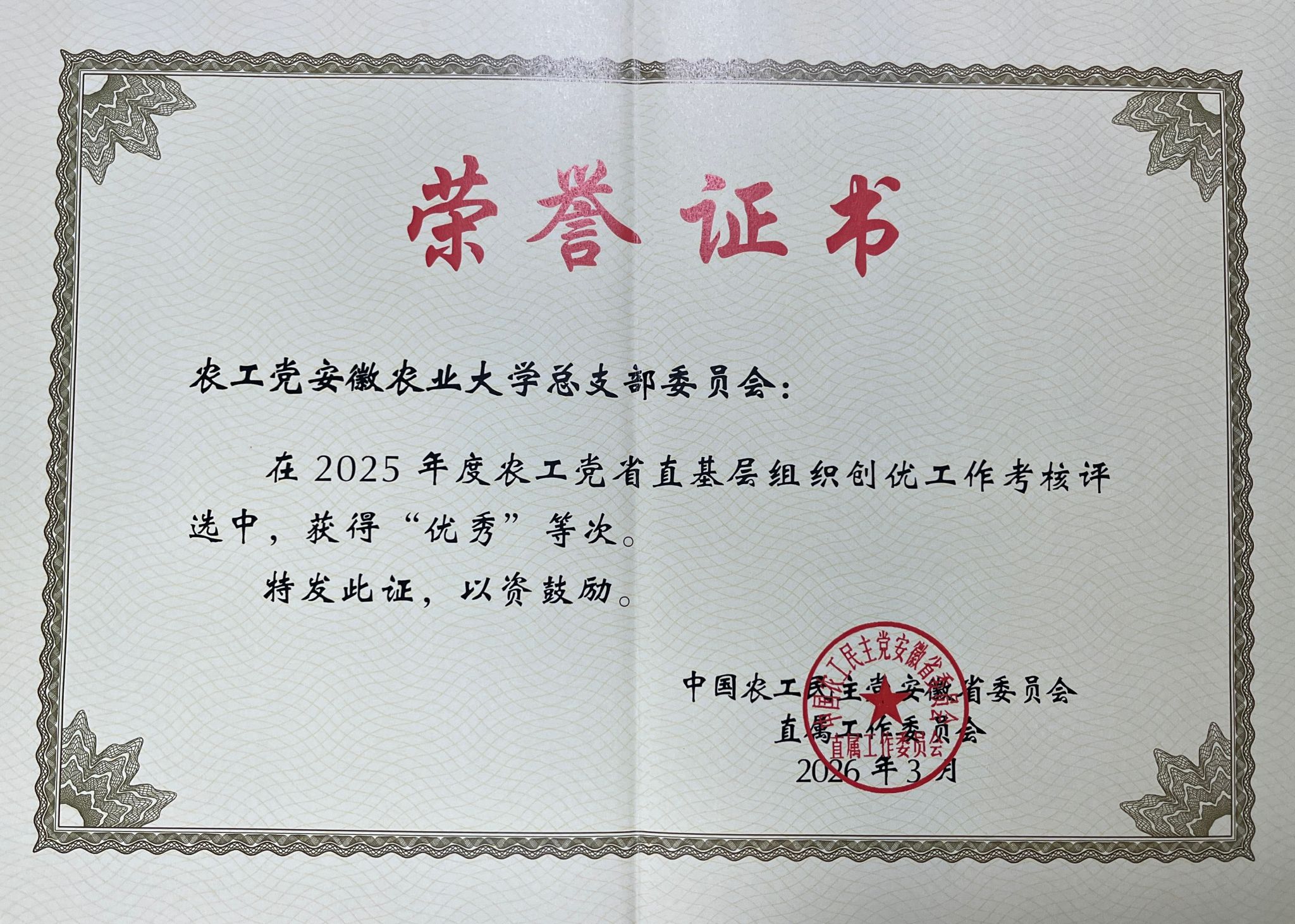 本网讯 近日,农工党安徽省直2026年度工作会议召开。我校农工党总支部委员会获评“基层组织创优工作考核优秀等次”,连续第八年获农工党省委会表彰。主委徐家萍、副主委葛高飞分获“2025年度参政议政工作先进个人”及“2025年度先进个人”称号。
