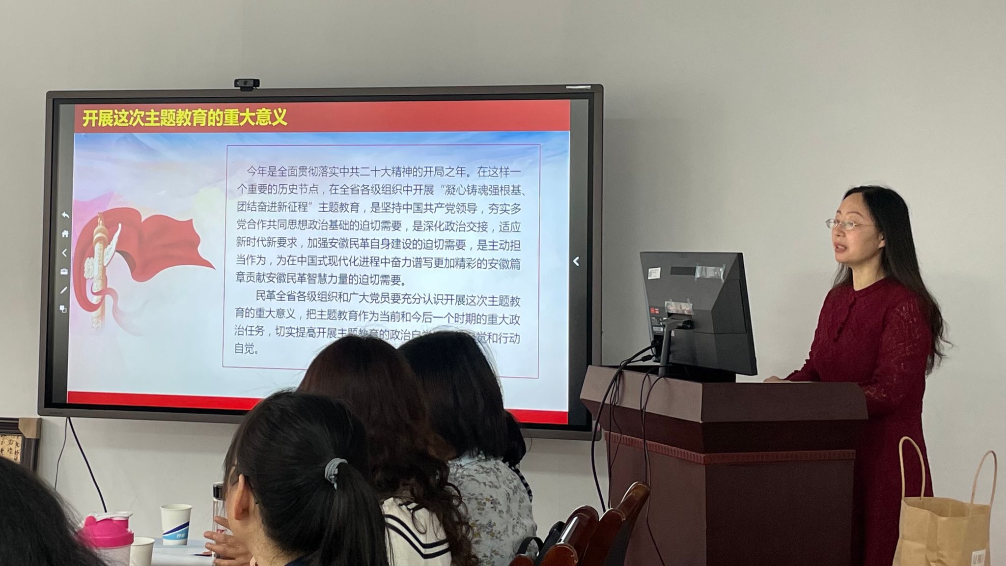 会议指出,开展“凝心铸魂强根基、团结奋进新征程”主题教育既是坚持中国共产党领导,夯实多党合作共同思想政治基础的迫切需要,又是深化政治交接,适应新时代新要求,加强自身建设的迫切需要。她强调,各位民革党员要准确把握主题教育的总要求和目标任务,推动主题教育走深走实。通过主题教育深刻领悟“两个确立”的决定性意义,增强“四个意识”、坚定“四个自信”、做到“两个维护”,始终在思想上、政治上、行动上同以习近平同志为核心的中共中央保持高度一致。要把理论学习作为主题教育的首要任务,把调查研究作为主题教育的重要内容,把助力发展作为主题教育的着力重点,把检视整改作为主题教育的关键抓手,全面把握,有机融合,整体推进,确保主题教育取得实效。