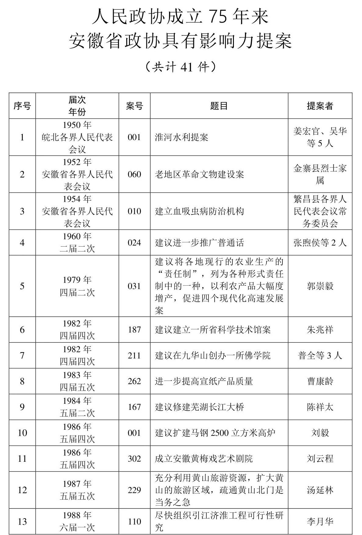 为庆祝人民政协成立75周年,充分展示75年来安徽省政协提案发挥的独特作用和产生的重要影响,省政协从1949年到2024年的3.2万余件提案中遴选出41件具有影响力提案。